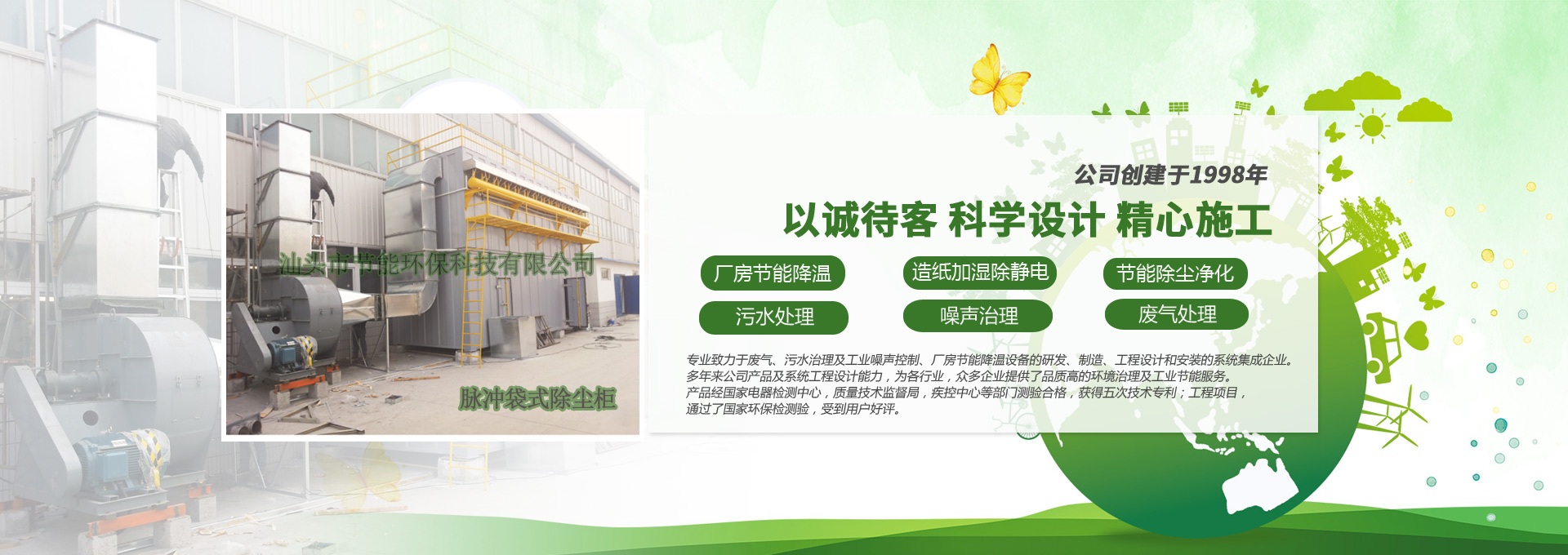 汕頭市節(jié)能環(huán)保科技有限公司創(chuàng)建于1998年,是一家專業(yè)致力于廢氣、污水、粉塵、噪聲治理,廠房節(jié)能降溫設(shè)備的研發(fā)、制造、工程設(shè)計和安裝的系統(tǒng)集成企業(yè)。多年來公司產(chǎn)品及系統(tǒng)工程設(shè)計能力,為各行業(yè),眾多企業(yè)提供了品質(zhì)高的環(huán)境治理及工業(yè)節(jié)能服務(wù)。產(chǎn)品經(jīng)國家電器檢測中心,質(zhì)量技術(shù)監(jiān)督局,疾控中心等部門測驗合格,獲得五次技術(shù)專利;工程項目通過了國家環(huán)保檢驗檢測,受到用戶好評。